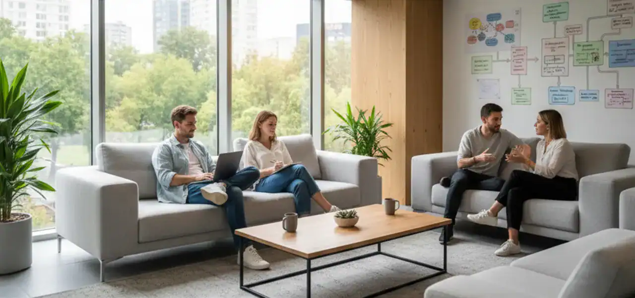 Productivity is shaped by the environment people work in. Informal seating areas with sofas encourage open conversations, making it easier to share ideas and solve problems quickly. These spaces support short, focused discussions without the formality of meeting rooms.