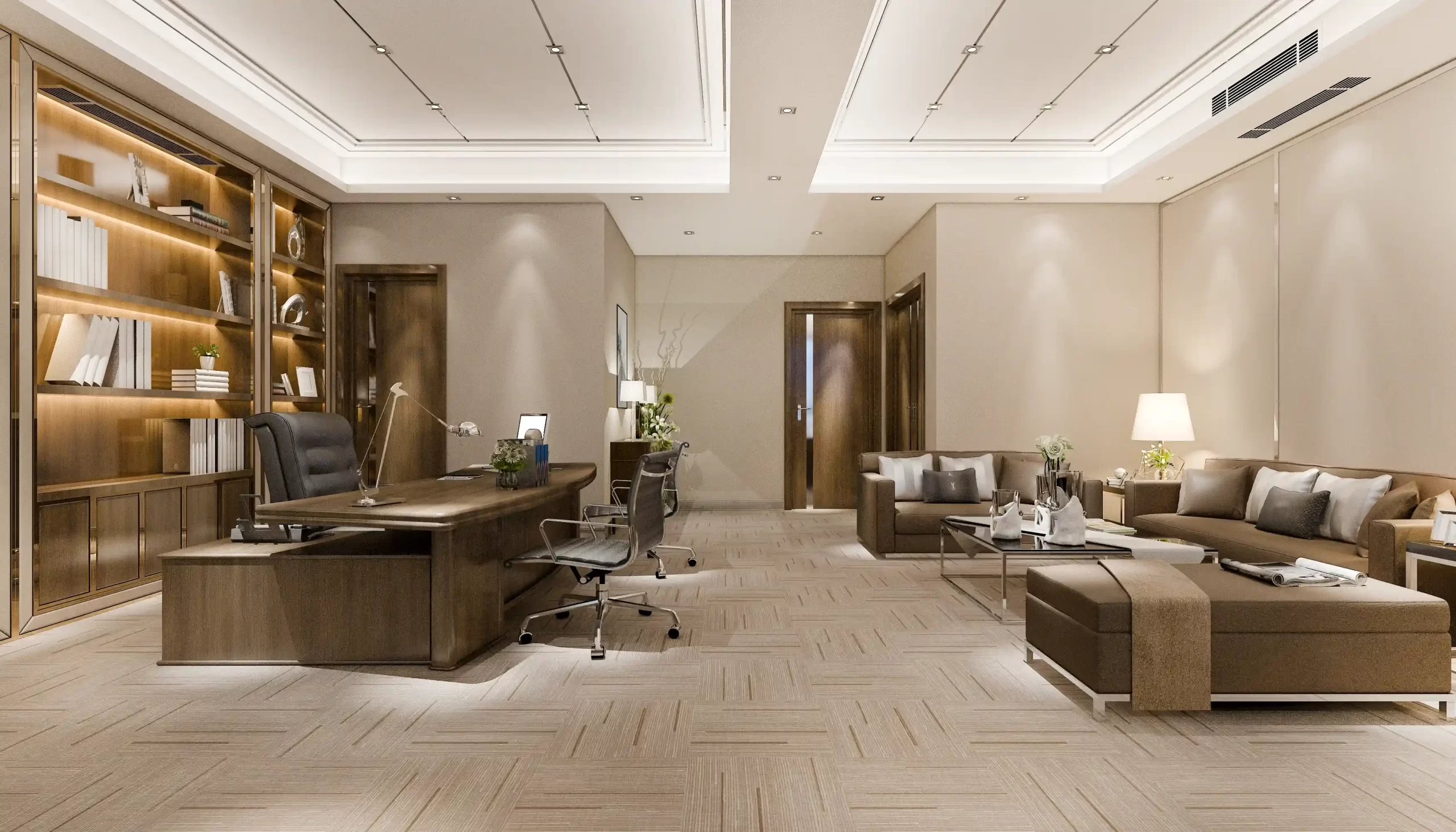 For CEOs looking to project sophistication and success, the modern luxury office design is a perfect fit. This style combines elegance with high functionality by using luxurious materials like marble, leather, and rich wood finishes. A large executive desk made from premium materials, such as mahogany or walnut, can serve as the center of attraction in the room, symbolizing authority and leadership.